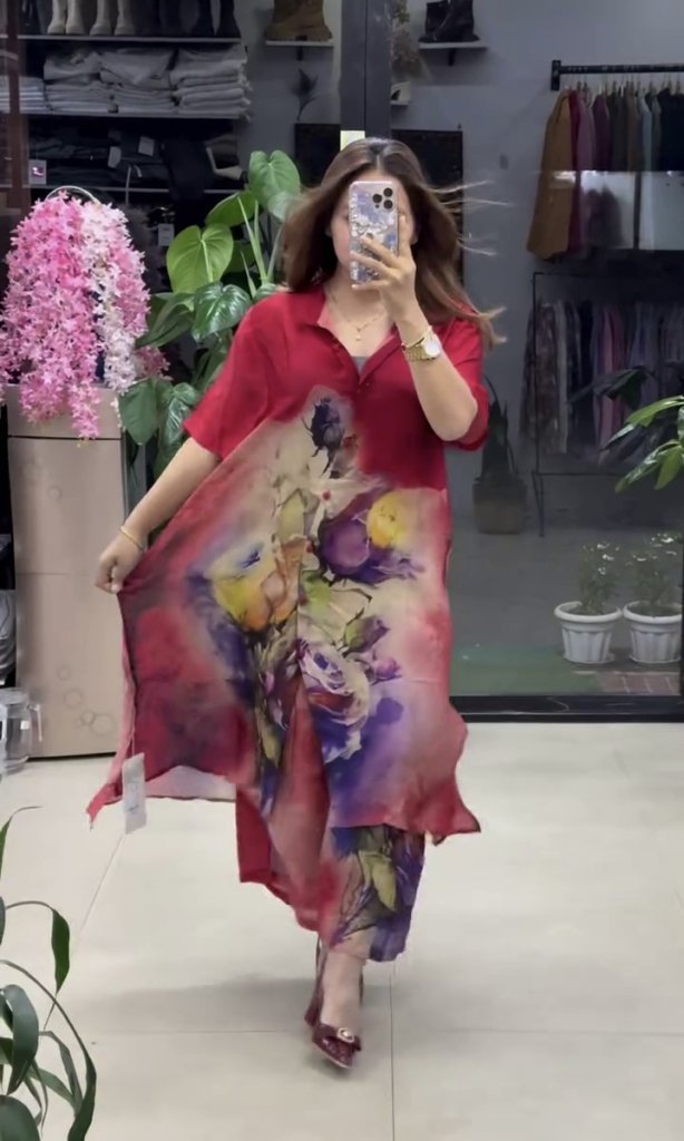 : The HELLY Long Shirt-Style Dress features a printed top and matching palazzo pants, crafted from soft, flowing georgette fabric